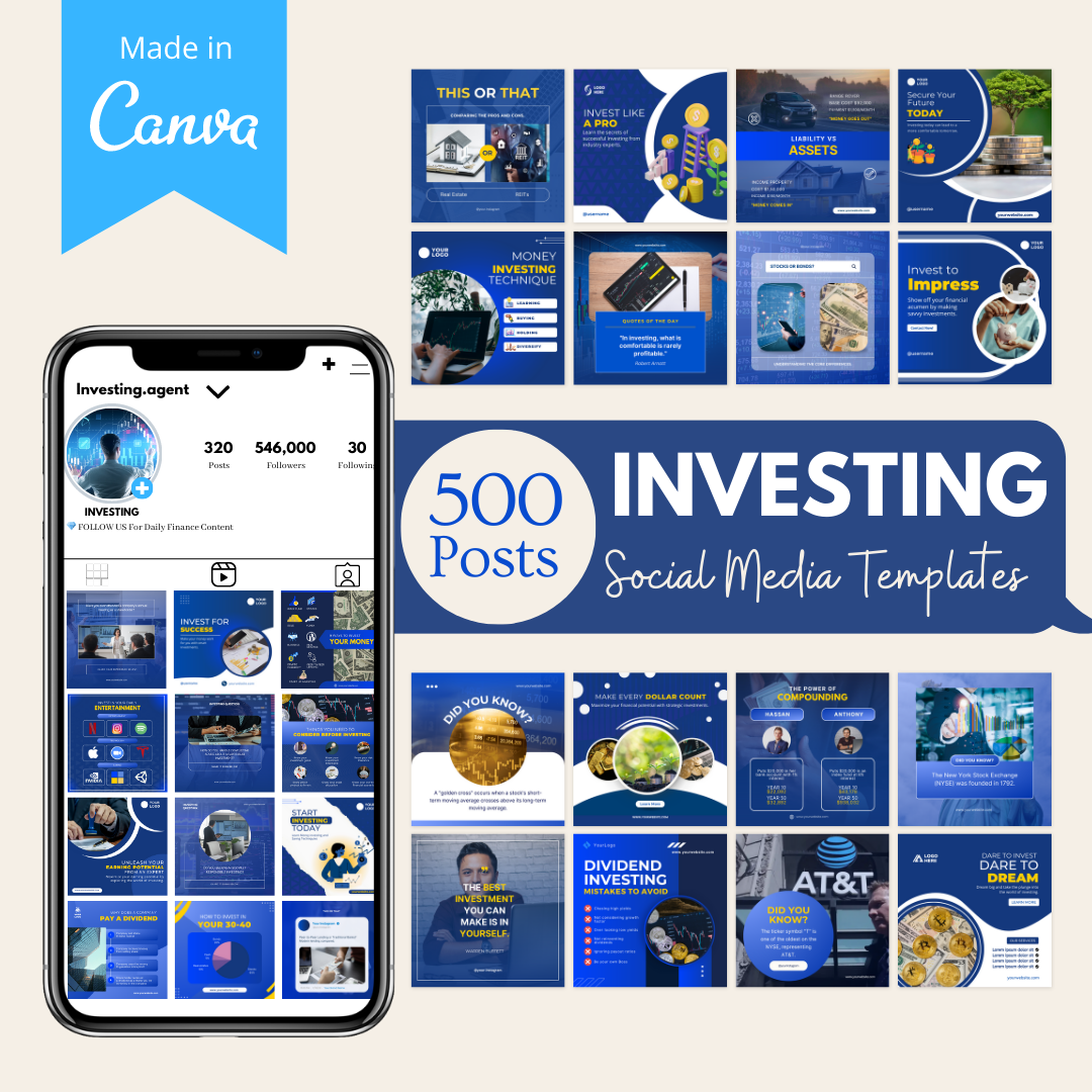 Unlock the ultimate arsenal of social media templates designed to skyrocket your financial influence online! 🚀 With 500 fully customizable Canva templates, we offer you the golden key to establish yourself as an investment guru on social media platforms. Share wisdom, ask questions, post reminders, and engage your audience while driving home the importance and value of smart investing. 🎨💡📈